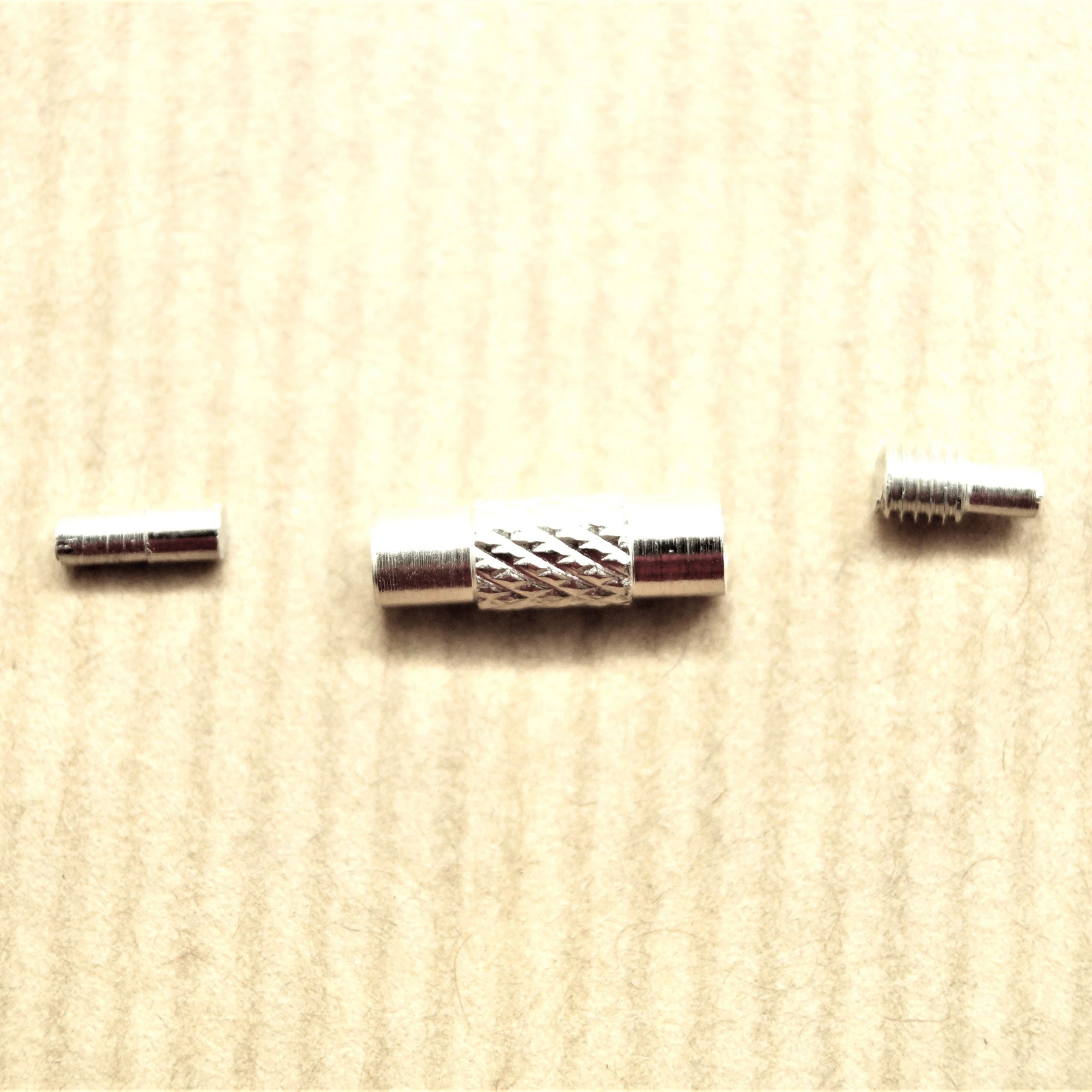 Ce fermoir barillet en trois parties est l’accessoire indispensable pour vos montages sur cordons ou câbles de 2,5mm. Sa conception ingénieuse permet de dissimuler le mécanisme de fermeture à l’intérieur d’un manchon central, offrant ainsi un design tubulaire continu et élégant, idéal pour les ras de cou et les bracelets. La fermeture par vissage assure une tenue parfaite, évitant les ouvertures accidentelles